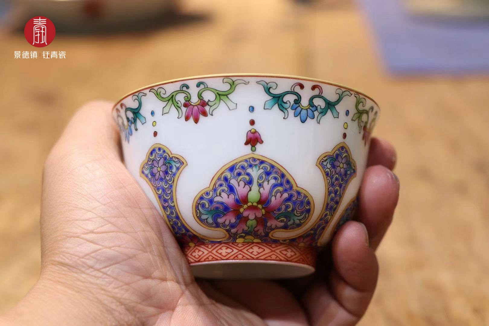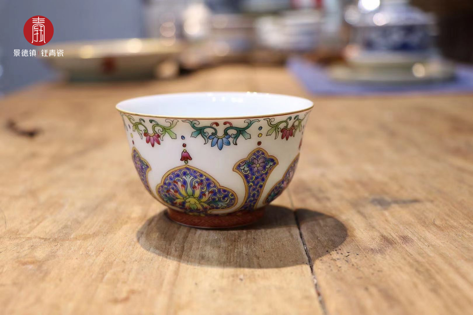 钰青珐琅彩主人杯纯手工制作,手工拉坯、手工绘制图案,同时使用钰青专用颜料,颜色雅致,韵味无穷,每一只都不尽相同。