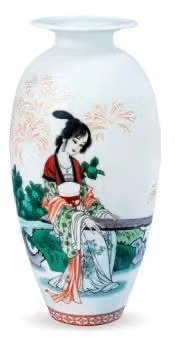 戴荣华,(1940-2017年),江西鄱阳人。中国工艺美术大师,中国工艺美术学会高级会员,江西省美术家协会会员。1962年曾赴北京故宫博物院,系统临摹整理明、清陶瓷纹样,历时两年,先后承担了国家用瓷和艺术陈设瓷、高档礼品瓷、日用陶瓷的装饰设计;后在中国轻工业陶瓷研究所从事陶瓷艺术。作品瓷胎选用上好的瓷石,用古法精心配制,白里泛青,属上乘精品力作,在业界被誉为“戴家胎”,画面人物仕女图,神态清新秀美,素香淡影,词心媚骨。古彩非常讲究线条的描绘力度,从中蕴含着多年的笔头功夫和技艺,用色流露出对色彩对比的修养,整体构图布局,彰显出深厚的东方美学涵养。仕女婉约动人,粉黛雅致,一片天真,稚情未去幻天宇。媚眼含羞合,丹唇逐笑开。