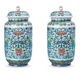 LOT 1159 谦六堂2021年 斗彩莲蝠纹盖罐(一对)