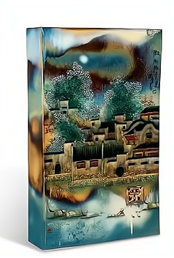 刘伟,1962年生,江西新干人。中国工艺美术大师,教授级工艺美术师,上海市政府首批原创设计大师工作室领衔大师之一,江西省“五一”劳动奖章获得者,享受江西省政府特殊津贴。作品获国家级大奖六十多项。作品在工艺上分别是窑变1300度,釉上彩800度二次烧成。高温窑变的色彩是可遇不可求,每个作品都是孤品。这件作品将窑变与勾描合为一体,通过勾画山村野里,反映了作者独特的乡土情怀,也表现出浓郁的东方诗意和民族底蕴。画面光与色的结合运用,展现出大自然的奇妙神韵。作品气势磅礴,富有浓厚的时代气息与民族风味。