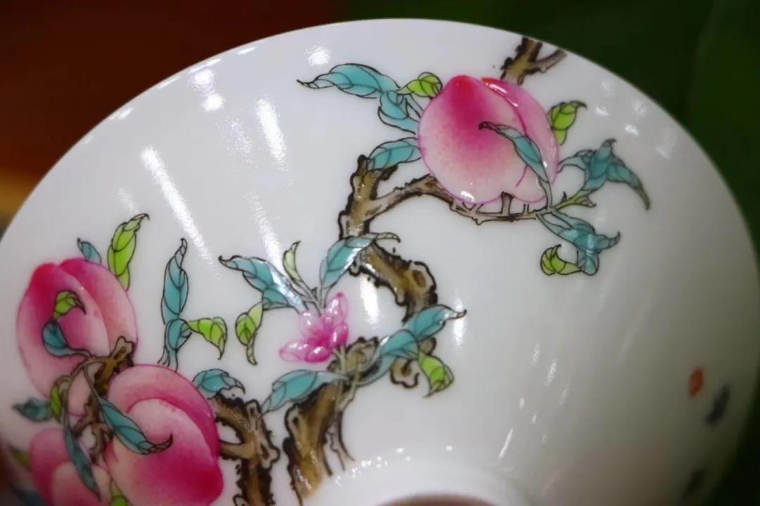 珐琅彩较厚的地方釉面会出现极细的开片,并明显有玻璃质感;粉彩不存在开片的问题,且无玻璃感(不反光)。珐琅彩没有蛤蜊光晕散现象,而粉彩器则有极美的蛤蜊光晕散在色彩的周围。