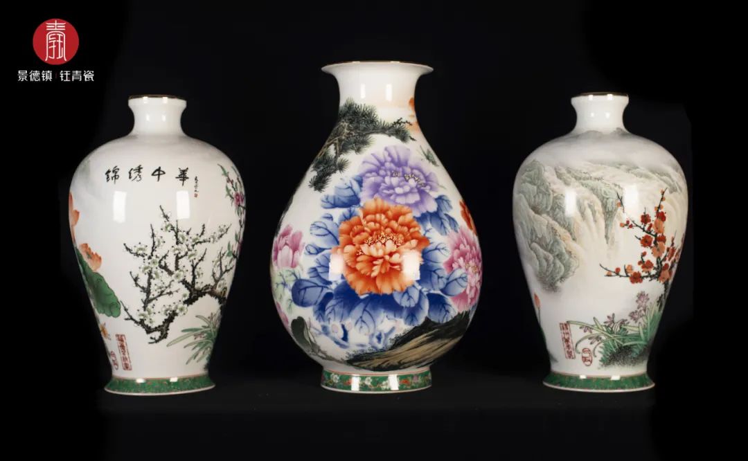 瓷器的器型主要指器物的外观形状,如口部、颈部、肩部、底部以及足部的形状,以此来判断它烧造的时代和窑口,这些是鉴定瓷器的重要方面。《锦绣中华》所采用的玉壶春瓶和梅瓶是最经典的传统器型,也是最高拍卖纪录保持者。主瓶玉壶春,体形细长,体现大方、庄重之美;辅瓶梅瓶,清新流畅,蕴涵吉祥、喜庆之意。