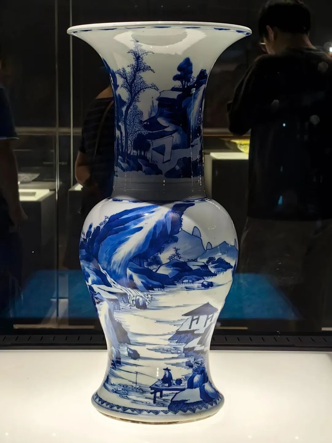 凤尾尊整体风格典雅高贵。其口部设计独特,自上而下逐渐收窄,形似喇叭;颈部较长,凸显出挺拔之感;腹部饱满,近足底处微微外撇,因整体造型形似优美的凤尾而得名。青花色泽青翠艳丽,浓淡相宜,层次丰富。运用青花“混水”技法,将青花料分头浓、正浓、二浓、正淡、影淡五个色阶,以浓淡不同的青料描绘远山近水,犹如中国传统水墨画般清朗不浑、艳而不俗。
