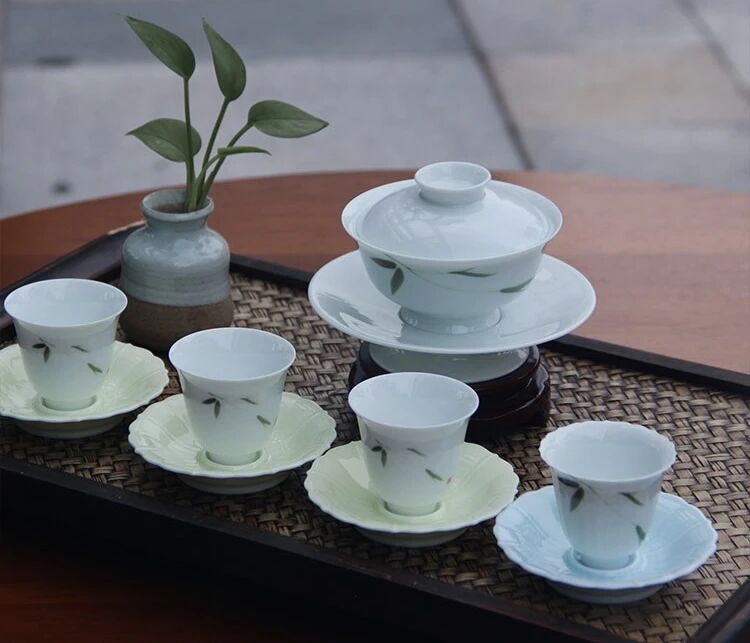 2. 摆核心定制茶具,景德钰青白瓷/青瓷盖碗+品茗杯组合,依人数摆好,2分钟搞定,杯身刻的春日纹样/专属雅号,瞬间拉满春日专属感;