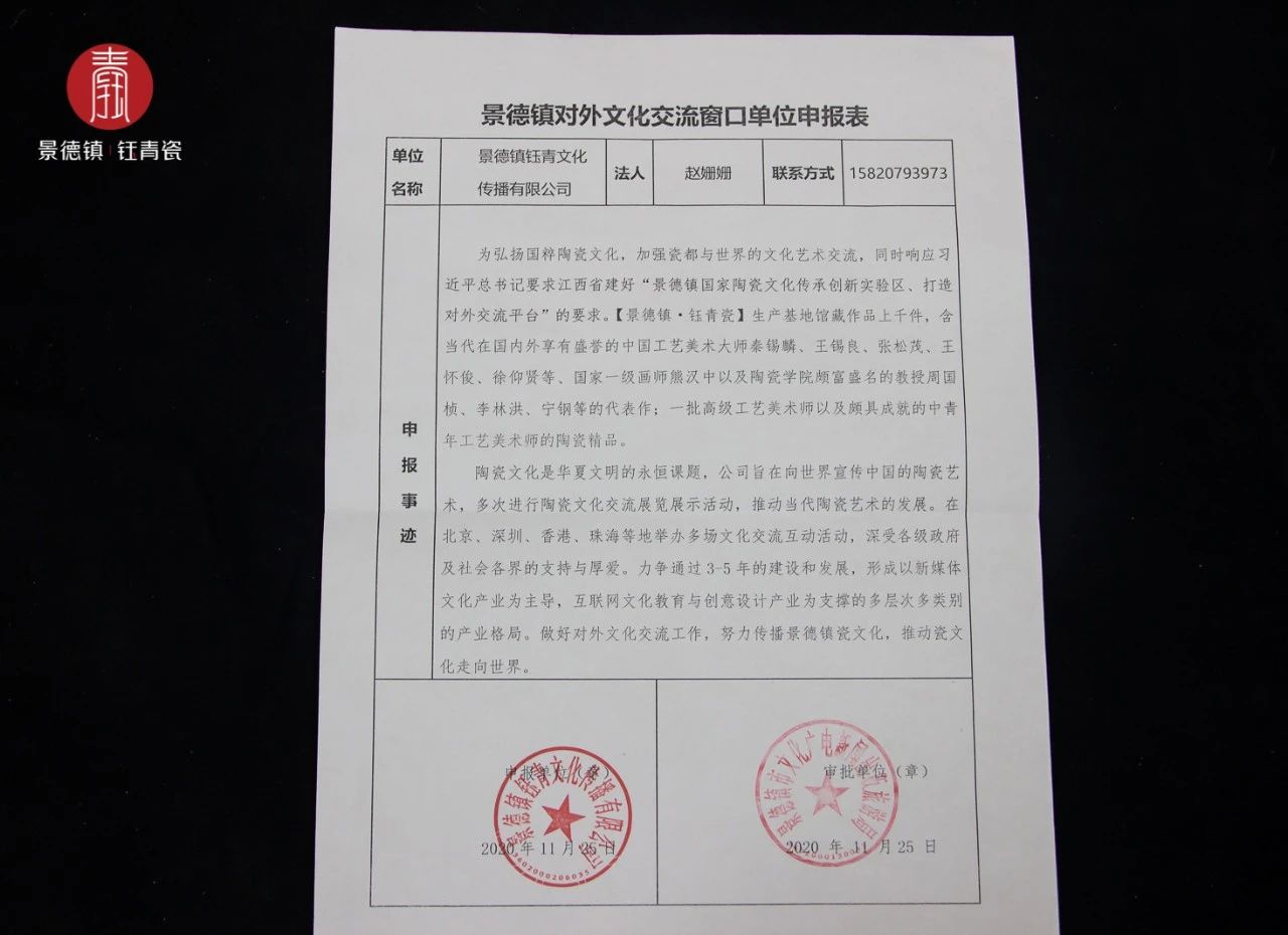 为加快对外陶瓷文化的宣传,同时贯彻习近平总书记“景德镇国家陶瓷文化传承创新实验区、打造对外交流平台”的重要指示,景德镇市文化广电新闻出版旅游局给对景德镇瓷文化交流做出杰出贡献的企业颁发“景德镇对外文化交流窗口单位”。