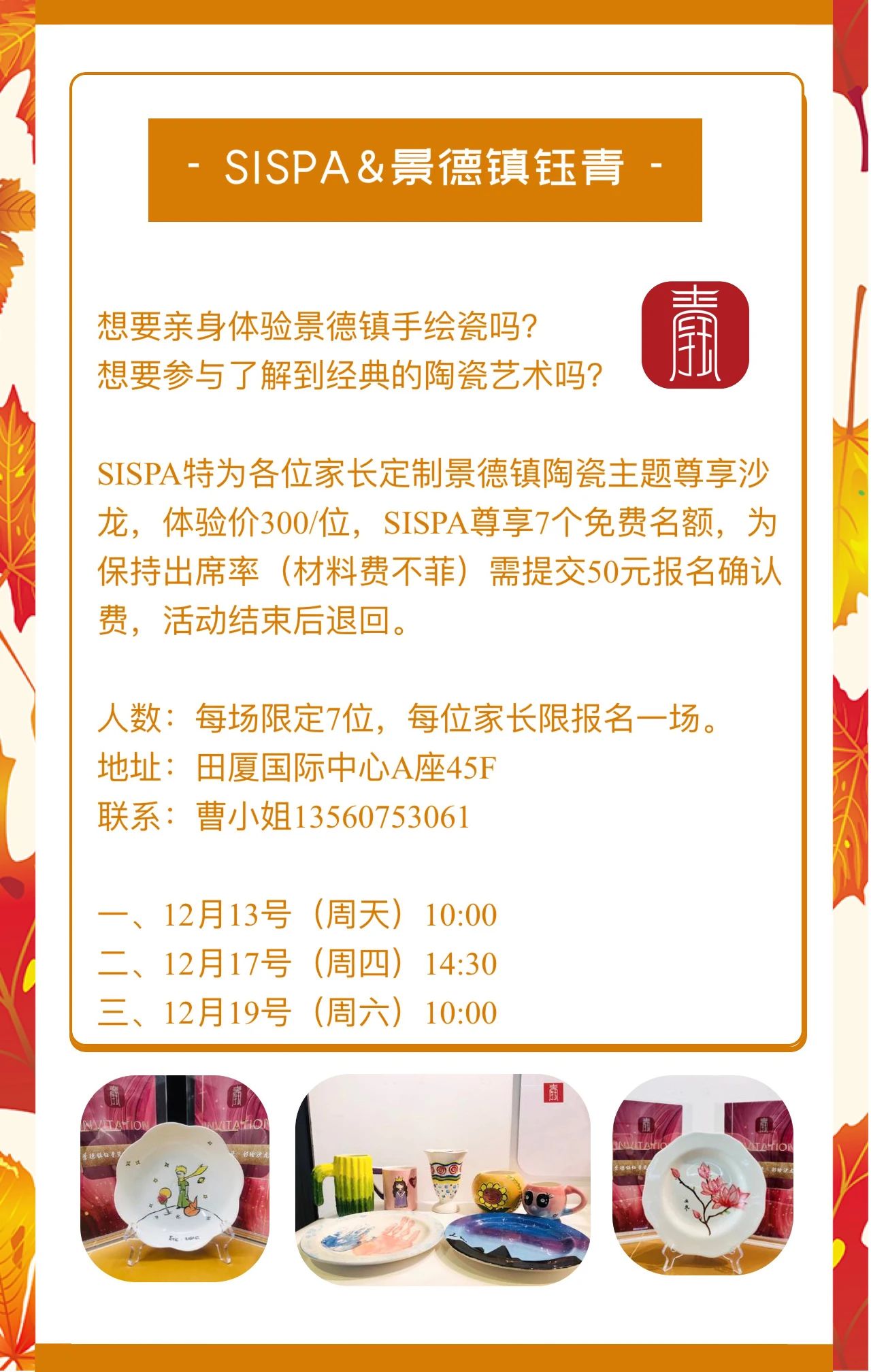 钰青为SISPA专属定制景德镇陶瓷彩绘沙龙,让家长们亲身体验陶瓷的魅力,定制专属于自己的陶瓷器皿,感受景德镇手工制瓷乐趣。