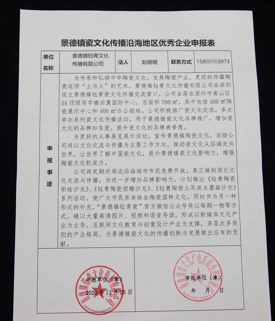 景德镇瓷文化传播沿海地区优秀企业,钰青申报成功!