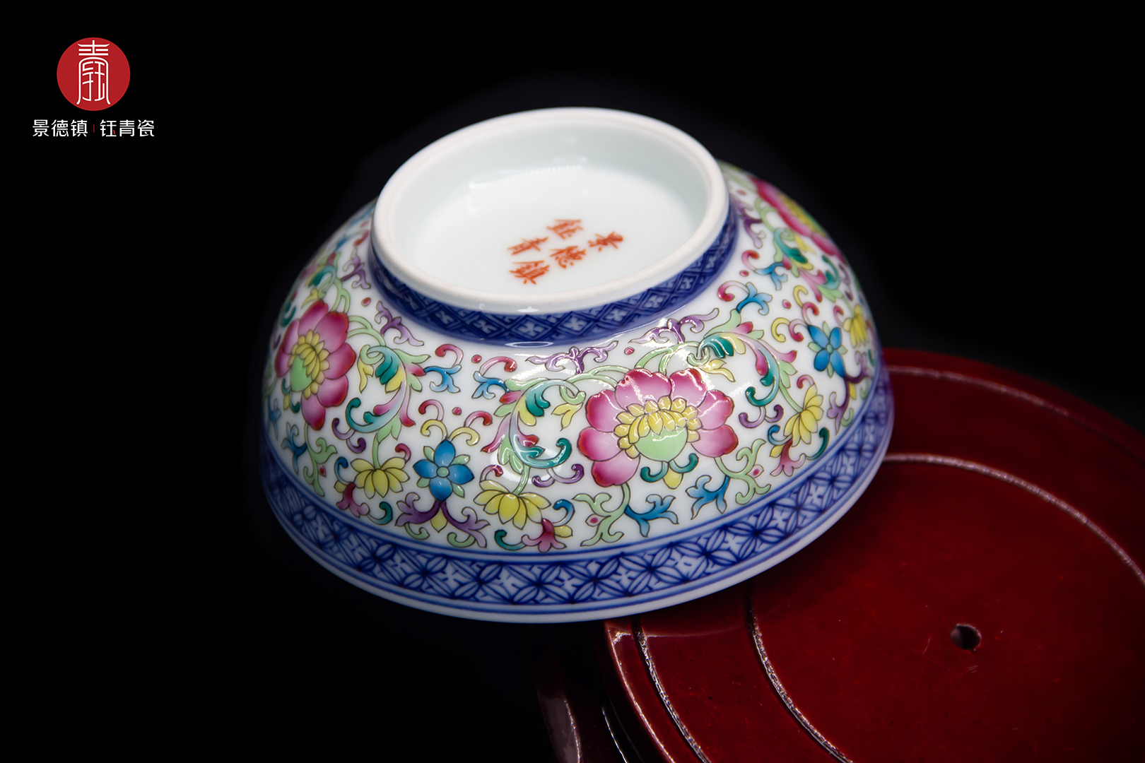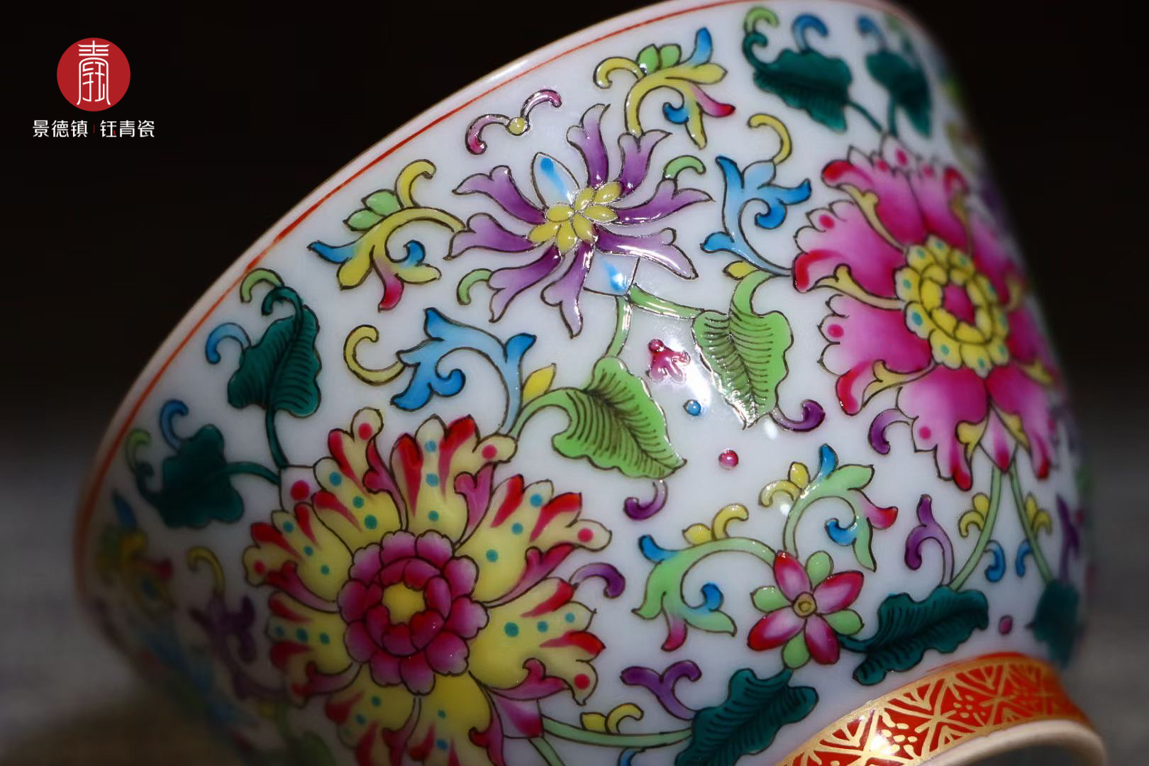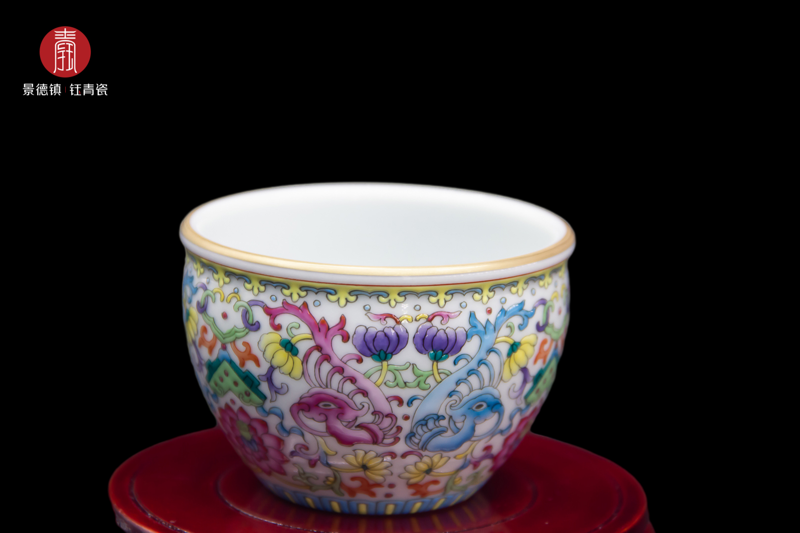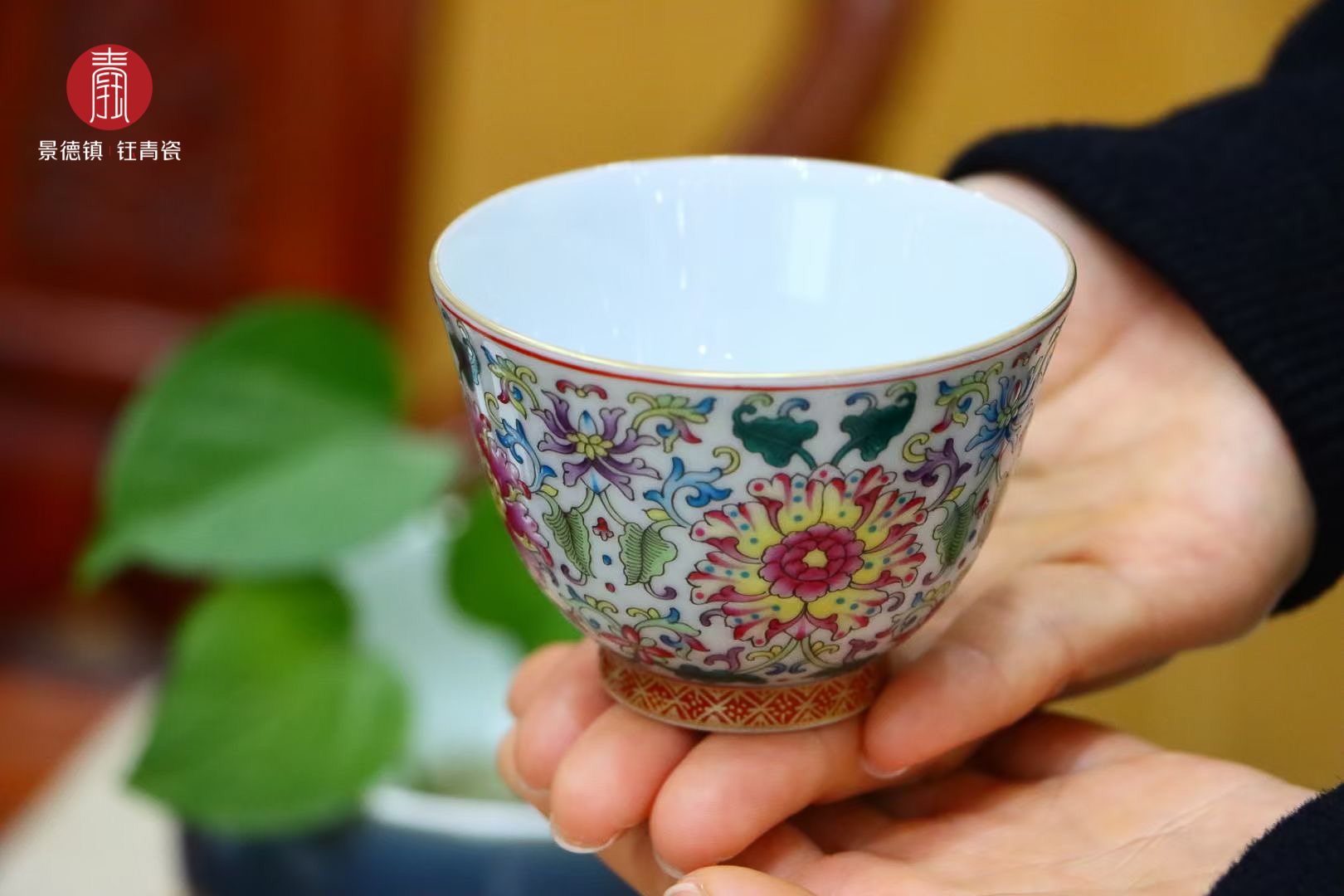 钰青珐琅彩主人杯采用景德镇纯度最高的、独有的高岭土经1380度高温烧制而成,胎质细腻,釉质莹润。