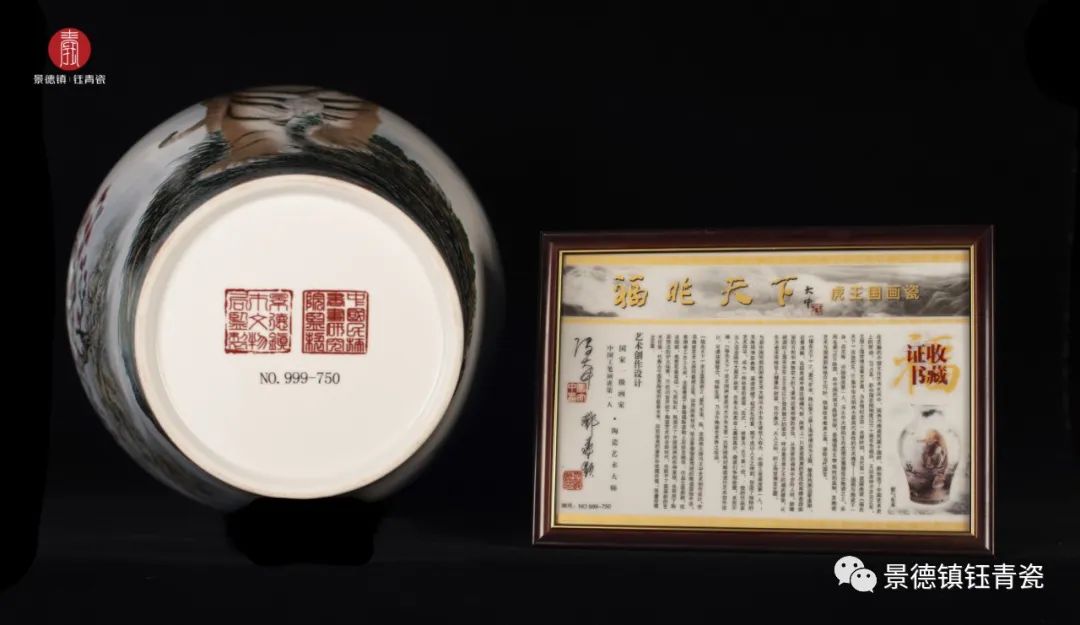 ——国画与陶瓷于一身,首次将"中国画虎第一人"冯大中大师的生肖虎国画完整描绘在陶瓷之上,采用毛瓷7501胎质,由景德镇市文物局、中国民族书画研究院特别监制,全面展现了景德镇陶瓷釉上彩技艺精华,其陶瓷艺术与国画韵味结合之巧妙,烧制技术难度之高,代表了古今国画陶瓷的最高水准,堪称当代国宝,限量999件。