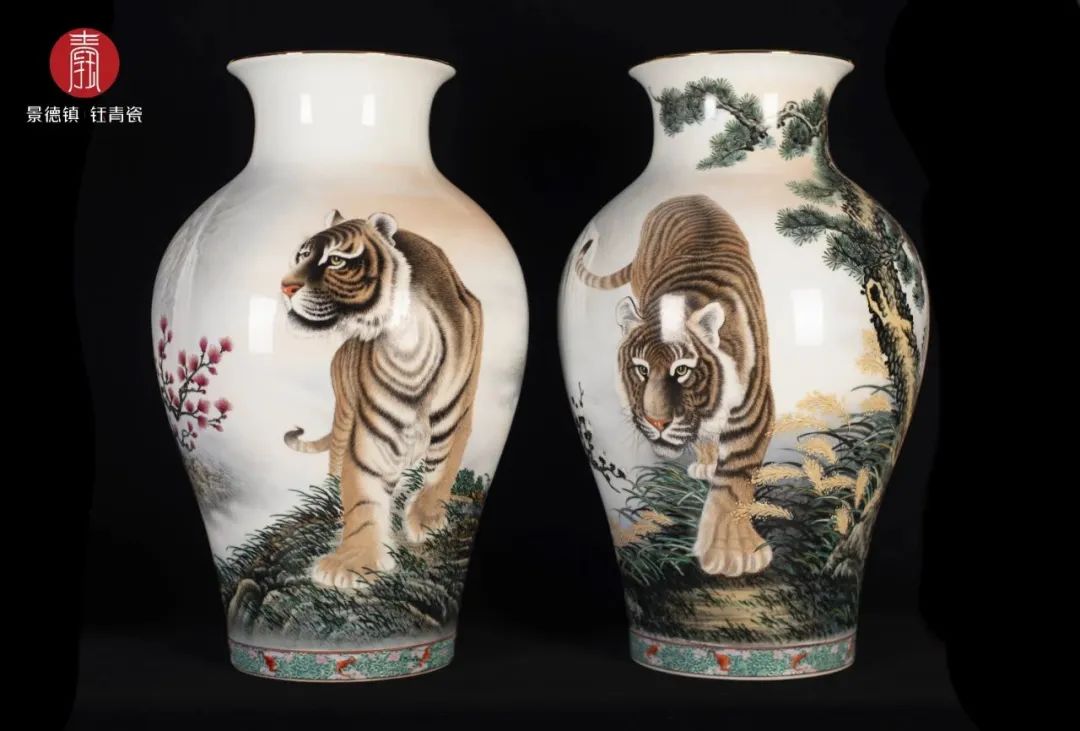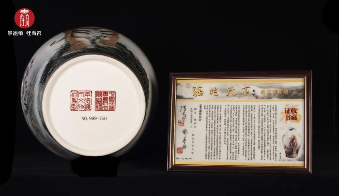 它集中华文明两大最具有代表性的艺术瑰宝 ——国画与陶瓷于一身,首次将"中国画虎第一人"冯大中大师的生肖虎国画完整描绘在陶瓷之上,采用毛瓷7501胎质,由景德镇市文物局、中国民族书画研究院特别监制,全面展现了景德镇陶瓷釉上彩技艺精华,其陶瓷艺术与国画韵味结合之巧妙,烧制技术难度之高,代表了古今国画陶瓷的最高水准,堪称当代国宝,限量999件。