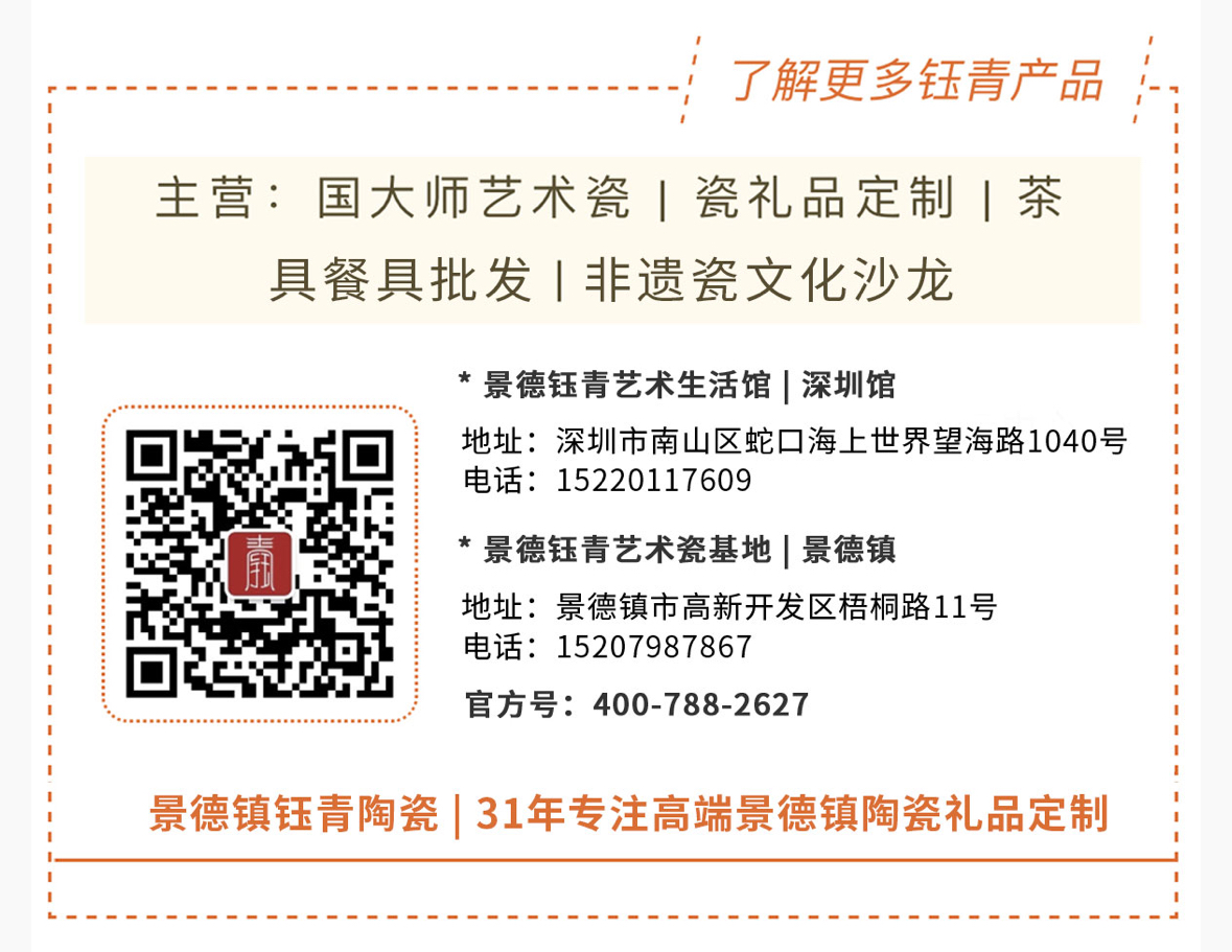 景德镇钰青陶瓷成立于1995年,景德镇设有景德钰青艺术瓷基地,深圳设有景德钰青艺术生活馆,政府官方认证。请搜索:景德钰青。 ▪️31年专注高端景德镇陶瓷礼品定制。 ▪️北京藏品:三件作品陈列北京人民大会堂。 ▪️深圳藏品:老瓷青花陈列于海上世界文化艺术中心V&A博物馆【设计的价值在中国】。 ▪️上海藏品:福兆天下虎王国瓷画陈列于上海世博会中国国家馆。 ▪️钰青荣誉:非物质文化遗产传播示范基地、景德镇瓷文化交流窗口单位、景德镇瓷文化传播沿海地区优秀企业、景德镇全国总商会常务理事单位、景德镇深圳商会副会长单位。 ▪️经典案例:为从都国际论坛、中建集团、招商蛇口、中集集团、中国平安、招商资本、四大行私行、北大光华EMBA、景德镇陶瓷大学、国际学校等定制系列礼品。 ▪️只做真正的景德镇瓷。