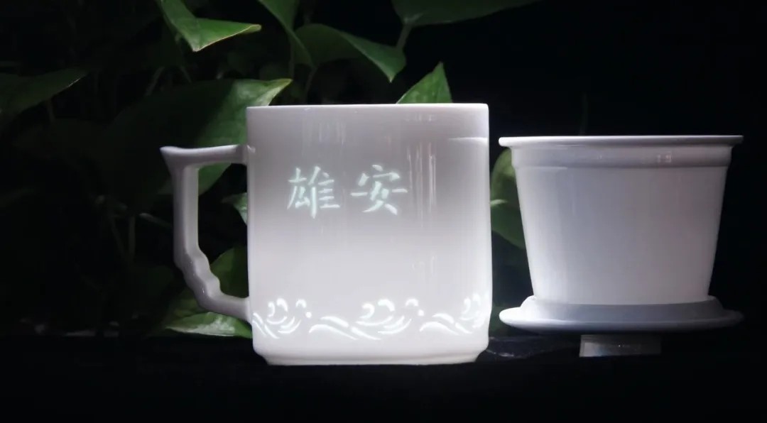 每件瓷器都是"手作孤品",国大师手绘青花需3天起稿,非遗玲珑工艺108道工序。(如雄安定制的玲珑办公杯,每个孔都是手工钻刻)